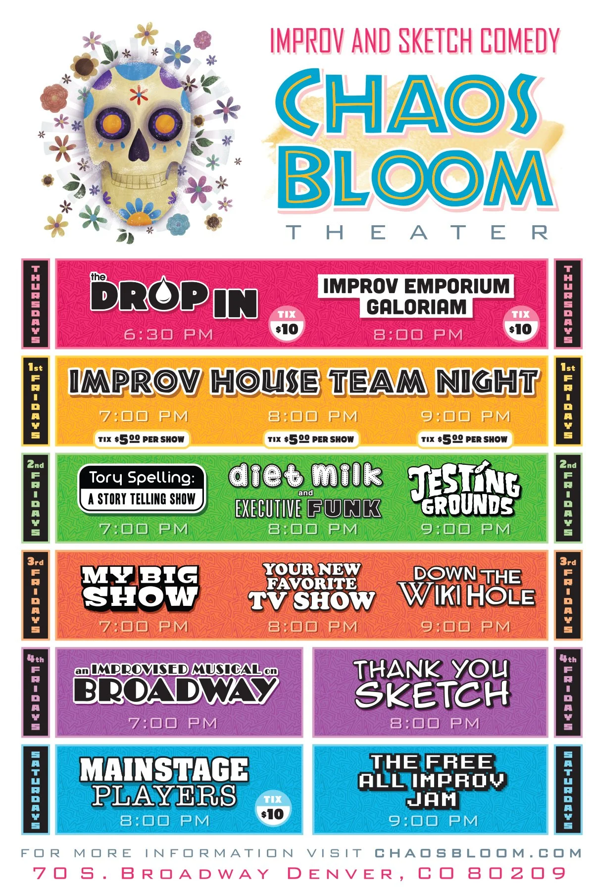 Chaos Bloom Theater is Denver's newest Improv and Sketch Comedy Theater, located in the eclectic Baker neighborhood on South Broadway. Fans of South Broadway's funky vibes will feel right at home in our bohemian-style theater.